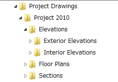 AutoCAD Architecture 2022 toolset の構造化されたプロジェクトで作業していない場合、元の図面はプロジェクト フォルダに整理し、レビュー用改訂済み図面はレビュー フォルダに整理します。比較が正常に実行されるように、プロジェクト図面はすべて同じ最上位フォルダに含まれている必要があります。図面比較を開始するときに、プロジェクト フォルダとレビュー フォルダの両方に対してこれらのソース フォルダを指定します。図面がプラン、立面図、および断面図として大まかに編成されている場合は、次のようになります。