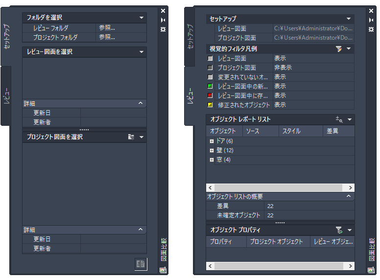 、Revit AutoCAD MEP toolset、Revit Architecture、Revit Structure の図面を比較できます。元の図面はプロジェクト図面です。改訂され、評価の対象となる図面がレビュー図面です。