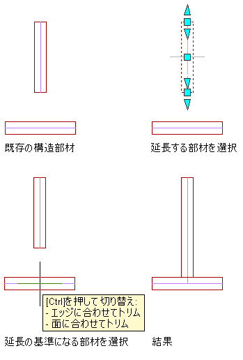 別の構造部材、別のタイプの構造オブジェクト、線図、または指定した任意の 2 点により定義(指定)された平面に基づく 1 つまたは複数の構造部材に対して、トリム面を生成するには、次の手順を実行します。トリム面を定義するエッジ、面、または線分は、トリムに選択した部材と交差する必要はありません。トリム面は現在の UCS XY 平面に垂直に投影されます。選択した部材は、トリム面と交差するか否かに応じて、トリム面に対して延長またはトリムされます。