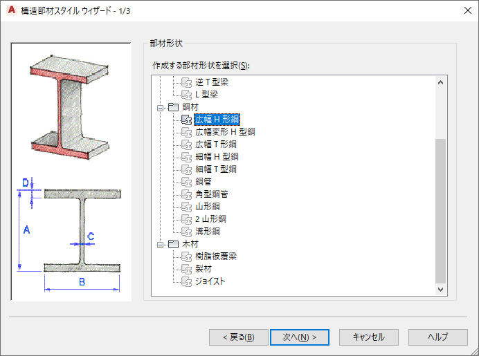 作成する部材のタイプ、形状、寸法が分かっている場合は、それらの情報を構造部材スタイル ウィザードから入力することで、目的のスタイルをすばやく作成できます。スタイル内の構造部材形状は、カタログ内の部材形状のいずれかに基づいて作成できます。