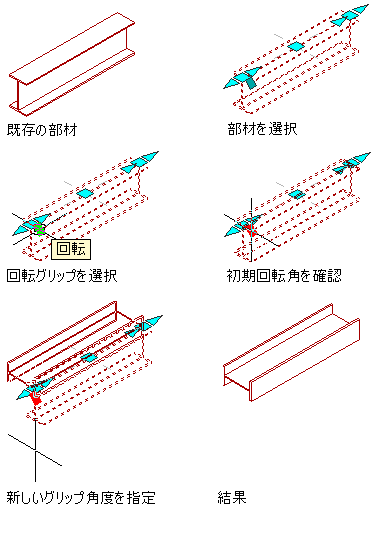 構造部材の押し出し軸に対する向きを、回転角を指定して変更するには、次の手順を実行します。正の値を入力すると、部材の終点から始点を見た場合に、部材は反時計回りに回転します。