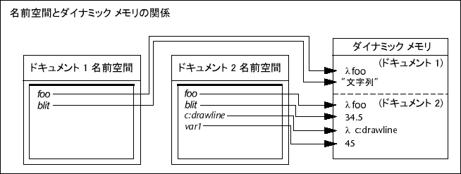 名前空間という概念は、ある図面ウィンドウ内で実行しているアプリケーションが知らないうちに他のウィンドウで実行しているアプリケーションの影響を受けないようにするために導入されました。開いている各 AutoCAD 図面ドキュメントはそれぞれのドキュメント固有の名前空間を持っています。あるドキュメントの名前空間で定義された変数や関数は、他の名前空間で定義された変数や関数とは切り離されています。