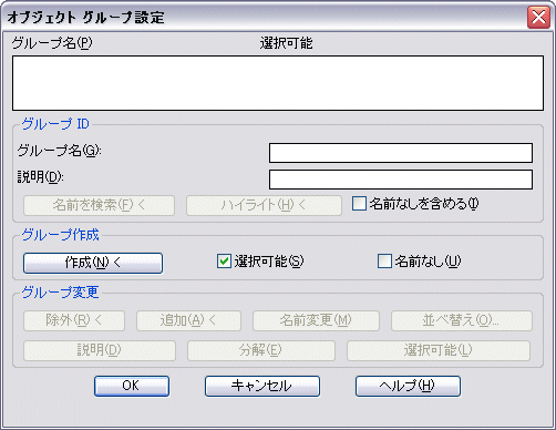 たとえば、次の図は[オブジェクト グループ設定]ダイアログ ボックスです。このダイアログ ボックスには、[グループ名]フィールドがあり、ユーザはこのフィールドに、作成しようとしている新しいグループの名前を入力できます。[名前なし]オプションが選択されていると、[グループ名]には入力できません。