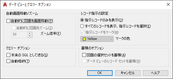 [データビューとクエリー オプション]ダイアログ ボックスを使用して、さまざまな表示オプションを設定できます。これらのオプションは、レコード(またはグラフィカル オブジェクト)を選択したときに、それにリンクされているグラフィカル オブジェクト(またはレコード)をどのように表示するかを指定します。