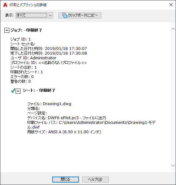 すべての完了した印刷とパブリッシュのジョブおよびこれらのジョブのシートに関する情報が表示されます。
