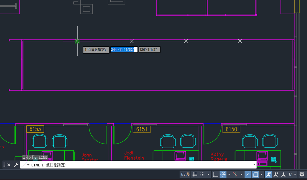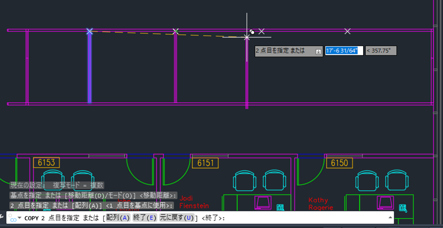 これで、壁を配置する位置を簡単に取得できるようになりました。LINE[線分]コマンドを使用して壁を作成し、次に COPY[複写]コマンドを使用して各点が配置されている位置に壁を複製します。
