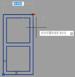 - 空白の図面で、窓を表す 36 × 72 の長方形を描きます。次のように、内側の長方形を描きます。窓の左下コーナーを 0,0 に配置します。この位置がブロックの挿入基点として使用されます。