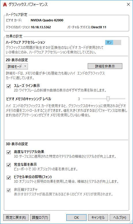 ハードウェア アクセラレーションの使用を有効にし、現在のドライバで使用可能なすべての効果の設定をコントロールできるようにします。オフにすると、[スムーズ ライン表示]オプションのみが有効になり、モードが既定のソフトウェア モードに切り替わります。