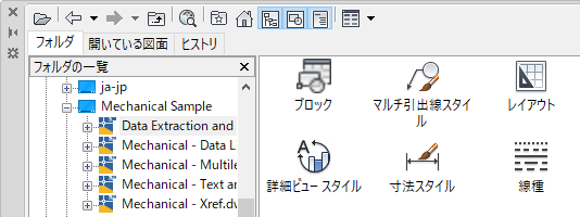 [DesignCenter]ウィンドウの左側部分のツリー表示と DesignCenter のタブを使用して、コンテンツを検索したりコンテンツ領域にロードすることができます。