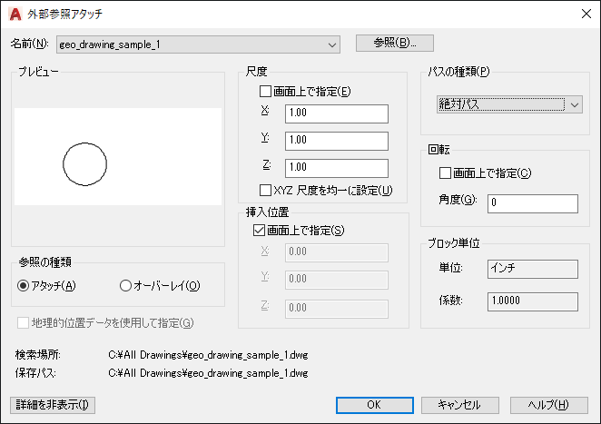 外部参照ファイルをアタッチしたとき図面とともに保存されるパスが表示されます。パスは、[パスの種類]の設定によって異なります。