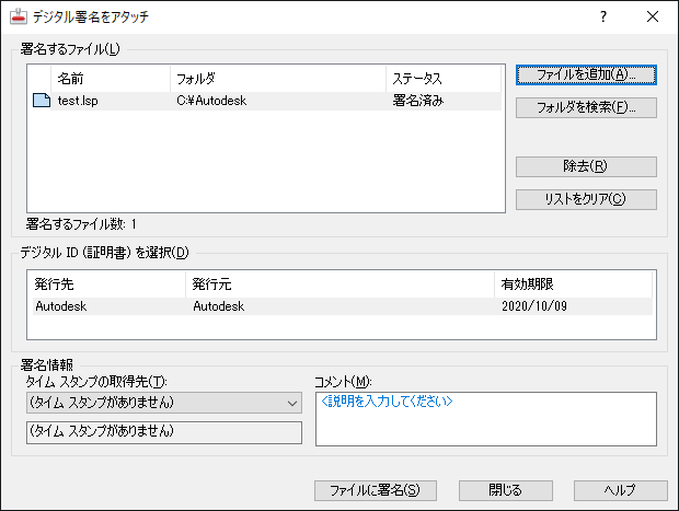 このダイアログ ボックスにリストされているすべてのファイルにデジタル署名をアタッチします。