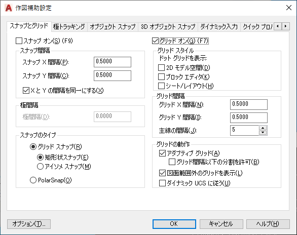 X 方向のグリッド間隔を指定します。この値を 0(ゼロ)にすると、グリッド間隔は[スナップ X 間隔]の値とみなされます。(システム変数 GRIDUNIT)