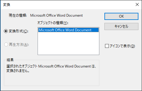 埋め込みオブジェクトを、[オブジェクトの種類]リストから選択した種類に変換します。