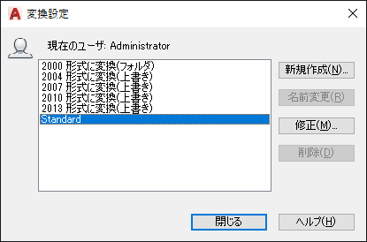リストに表示されている変換設定の名前を変更します。変更できるのは、作成した変換設定の名前のみです。変換設定 Standard の名前は変更できません。