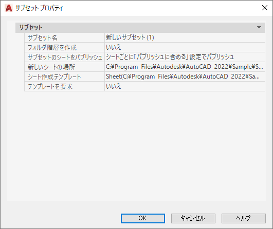 このサブセットの新しい図面ファイルを作成する場合に使用する図面テンプレート(DWT)ファイルとレイアウト名を指定します。