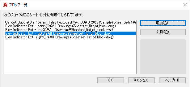 このダイアログ ボックスは、[ビュー分類]ダイアログ ボックスで[ブロックを追加]ボタンをクリックする、または[シート セット プロパティ]ダイアログ ボックスの[吹き出しブロック]の[...]ボタンをクリックすると表示されます。