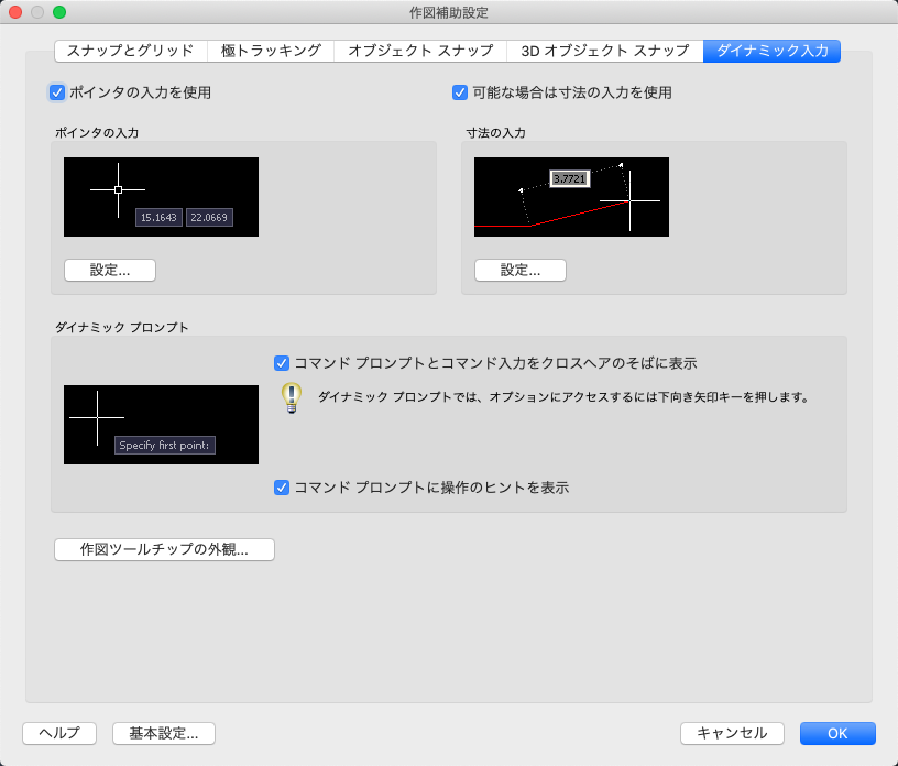 ポインタ入力、寸法入力、ダイナミック プロンプト、および作図ツールチップの外観をコントロールします。