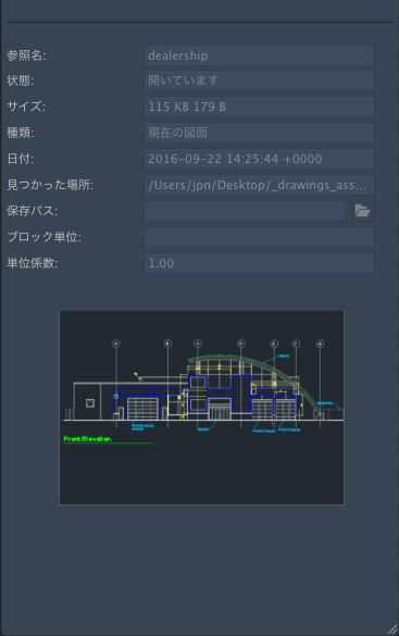 DWG (外部参照)を選択すると、その他のプロパティが表示されます。参照イメージ固有のプロパティは、いずれも編集できません。