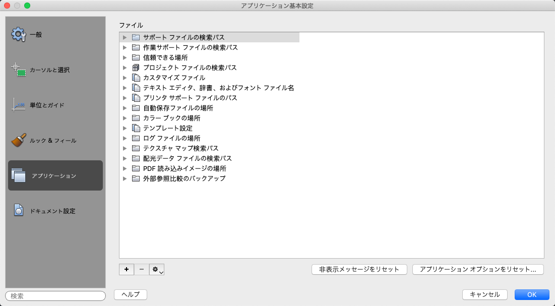 プログラムが、サポート ファイル、ドライバ ファイル、メニュー ファイル、その他のファイルを検索するフォルダを指定します。また、スペルチェックに使用する辞書などのユーザ定義設定を指定することもできます。