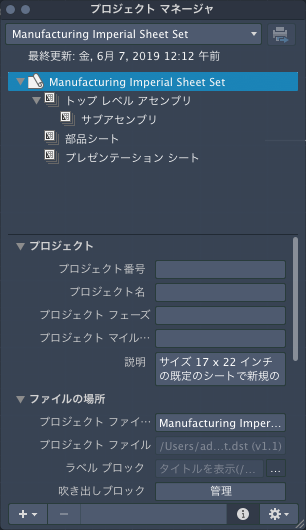 [詳細]パネル: プロジェクト ツリー表示で選択した項目のプロパティが表示されます。[詳細]パネルの表示を切り替えるには、[プロジェクトマネージャ]の下部にある[詳細を表示]/[詳細を非表示]ボタンをクリックします。