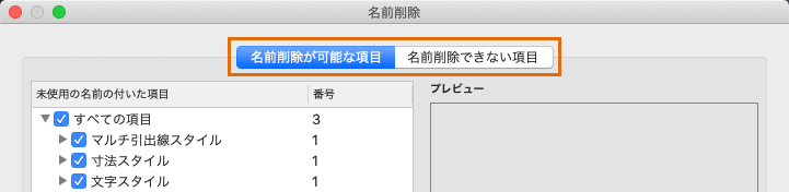 名前削除できない項目のプレビューが表示され、それらのオブジェクトを図面内で検索することができます。