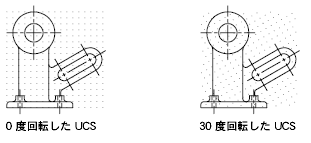 特定の向きや角度に沿って作図する必要がある場合は、ユーザ座標系(UCS)を回転することで、グリッドとスナップの角度を変更できます。スナップ角度を回転することにより、新しい角度に一致するように画面上のクロスヘア カーソルの位置が調整されます。次の例では、アンカー ブラケットの角度に合わせて、UCS を 30 度回転させています。