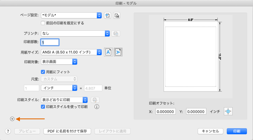 [印刷]ダイアログ ボックスの一部のオプションを非表示にするか、すべてのオプションを表示するかをコントロールするには、示されている矢印をクリックして展開します。