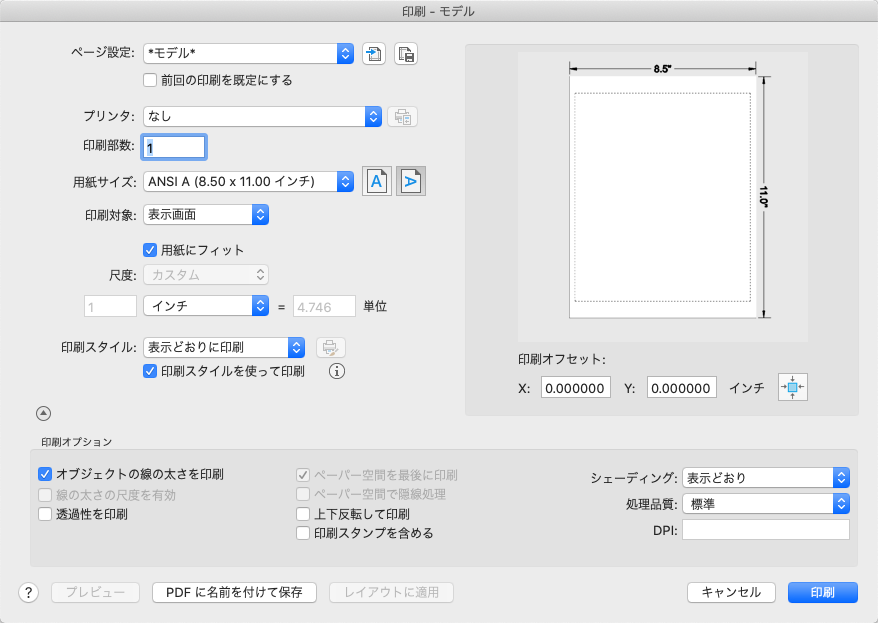 印刷の設定作業が簡単になるように、このような設定の集まりを保存し、名前で呼び出すことができます。これを「ページ設定」と呼んでいます。 ページ設定を使用することで、異なるプリンタでの印刷、グレースケールでの印刷、図面からの PDF ファイルの作成などに必要な設定を格納することができます。
