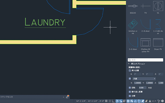 [ブロック]パレットからブロックをドラッグすると、[挿入オプション]の尺度と回転の値が使用されるようになりました。