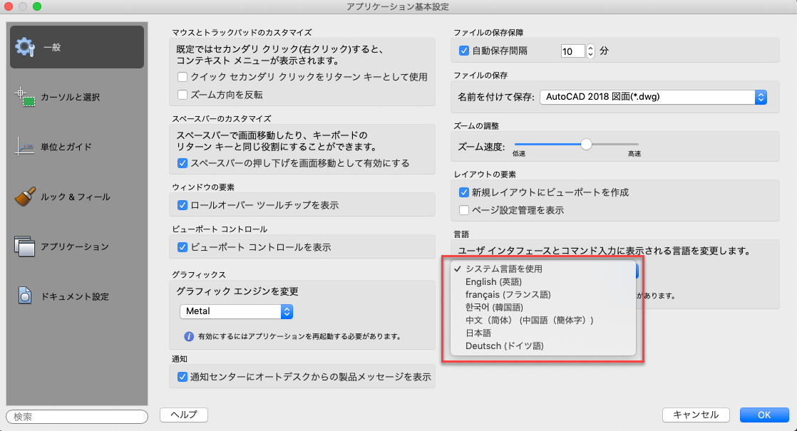 AutoCAD for Mac は、ドイツ語および日本語をサポートするようになりました。[アプリケーション基本設定]ダイアログで言語を変更することができます。言語の変更を確認するには、AutoCAD for Mac を再起動する必要があります。