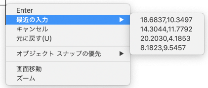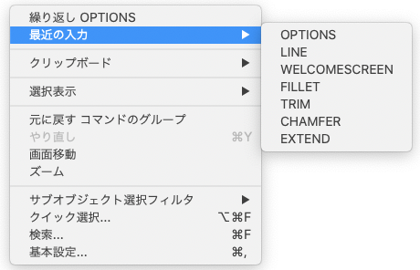 ショートカット メニューの[最近の入力]を使用して、コマンドまたはコマンド入力を繰り返すことができます。ショートカット メニューを表示するには、右クリックします。