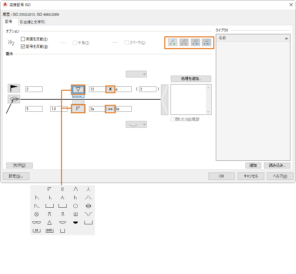 溶接記号が AutoCAD Mechanical 2021 ツールセットで更新され、最新の ISO 規格および DIN 規格の履歴(ISO 2553:2013 および DIN EN ISO 2553:2014)をサポートするようになりました。この変更には、要素記号と追加記号の改訂、および新しい溶接の注釈(2 点間の距離)が含まれます。マルチ基準線のサポートも最新の履歴に追加されています。