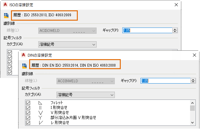 ISO 規格および DIN 規格の新しい履歴に対するサポートが追加されたことにより、溶接規格の最新の履歴を使用して AutoCAD Mechanical ツールセットで作成されたドキュメントに注釈を付けることができます。新しいドキュメントでは最新の履歴を使用できますが、AutoCAD Mechanical ツールセットは引き続き旧バージョンの履歴をサポートし、旧リリースで作成されたドキュメントを開いたり、編集したり、保存できるようになっています。