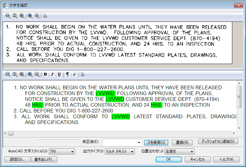- [編集]ペインでハイライト表示された文字部分を確認します。[次を検索]ボタンをクリックして、一番初めの確認する必要がある語句、または認識できなかった文字を[修正後]ボックスに表示します。[修正後]リストから語句を選択するか、正しい語句を入力して、[置換]ボタンをクリックします。語句や略語を認識ディクショナリに追加する場合は、[ディクショナリに追加]ボタンをクリックします。[OK]をクリックすると、AutoCAD のカスタム ディクショナリにも語句を追加するかどうかを尋ねるプロンプトが表示されます。