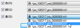 [バンド割り当てのカラー マップ]ダイアログ ボックスで、3 つのドロップダウン リストを使用して、カラー チャンネルを以下のように割り当てます。