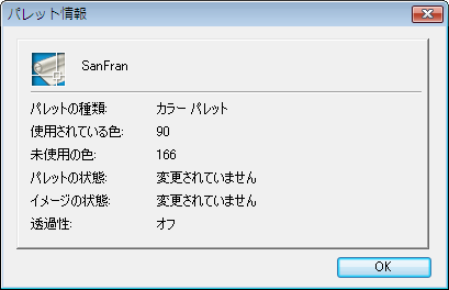 [情報]を選択します。[パレット情報]ダイアログ ボックスに、使用可能な 256 色のうち 90 色だけが使用されており、このイメージでは背景の透過性がオフになっていることが示されます。[OK]をクリックします。