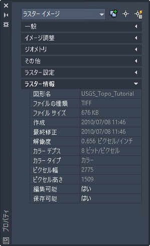 この例は、イメージを選択したときの[プロパティ]ウィンドウの外観を示しています。[ラスター イメージ]が選択されており、イメージ データが[情報]領域のプロパティ リストの最後に表示されています。