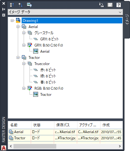 イメージ管理ツールスペースは、図面に関連付けられているイメージ データの構造を表示します。 このダイアログを使用して、イメージ ファイルの管理、その表示順序またはアクティブ パスの変更、カラー マップの編集、およびイメージの他の場所への書き出しを行うことができます。