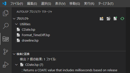 AutoLISP プロジェクトを使用して、AutoLISP ソース(LSP)ファイルを論理的にグループ化することができます。AutoLISP プロジェクトは、拡張子 .prj のファイルに保存されます。PRJ ファイルには、ローカル フォルダまたはネットワーク フォルダ、または Git リポジトリを表すフォルダに既に保存されている LSP ファイルへの参照が含まれています。AutoCAD AutoLISP Extension によって、[Activity]バーに、[AutoLISP Project Manager]という名前のビューが定義されます。このビューから PRJ ファイルを作成および開くことができます。