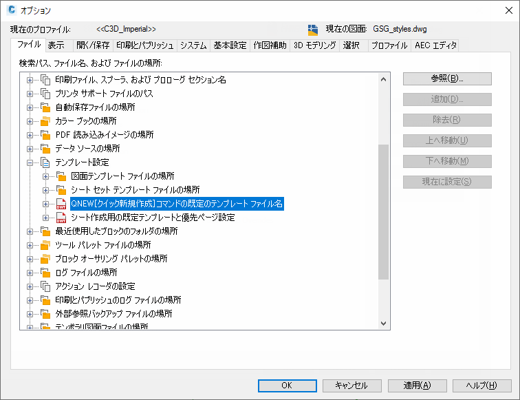 インペリアル法の縦断を使用して Autodesk Civil 3D を開始する場合、新規図面の既定のテンプレートは _Autodesk Civil 3D (Imperial) NCS.dwt です。メートル法の縦断を使用して Autodesk Civil 3D を開始する場合、新規図面の既定のテンプレートは _Autodesk Civil 3D (Metric) NCS.dwt です。既定のテンプレートは、Autodesk Civil 3D を起動したとき、または新しい図面(QNEW[クイック新規作成]コマンド)を作成したときに適用されます。各自のニーズに合わせて、別の既定テンプレートを指定することもできます。
