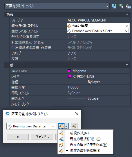 [プロパティ]パレットのスタイル プルダウン メニューから、[作成/編集] (図 13 を参照)を選択して[オブジェクト(区画分割線ラベル)スタイル]ダイアログ ボックスにアクセスします(図 14 を参照)。