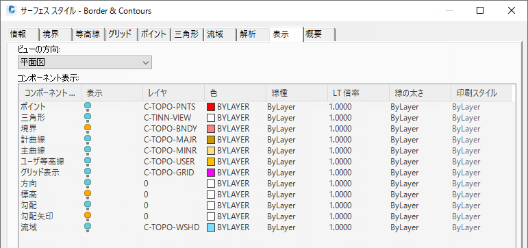 C:\Program Files\AutoCAD 2022\C3D\Help\Civil Best Practices Guide にあるサンプル スタイル図面 Sample_styles.dwg を開きます。サーフェス スタイルは、異なる設計ステージの異なるサーフェス コンポーネントを表示するように設計されています。図面に割り当てられたサーフェス スタイルを、現況地盤等高線と言います。これは、プロジェクトの設計ステージで使用されるスタイルの一例です。