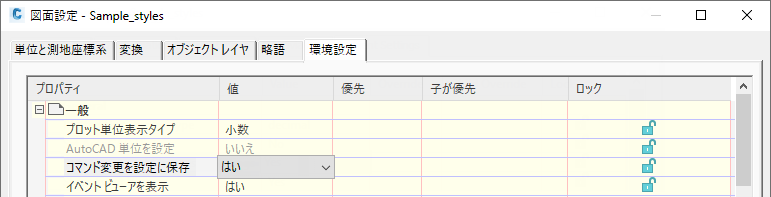 - [環境設定]タブをクリックし、[一般]プロパティを展開します。[コマンド変更を設定に保存]プロパティを[はい]に設定します。