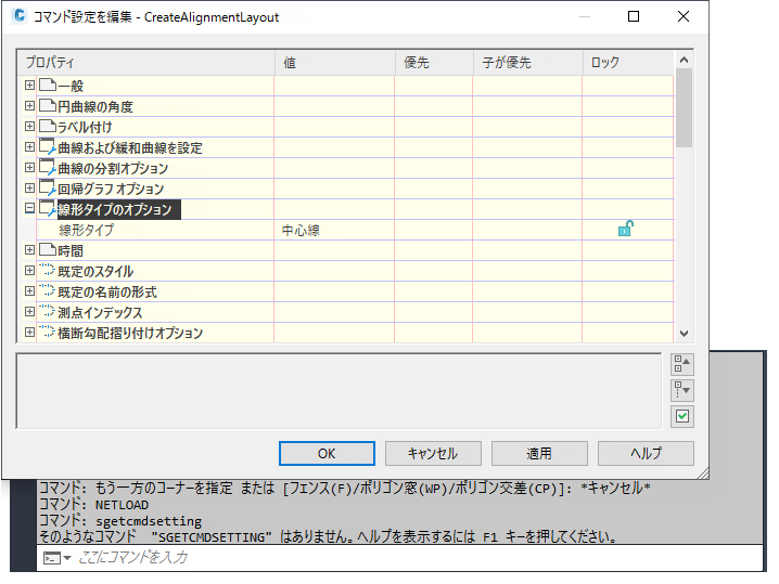 コマンド設定はコマンドに適用され、Autodesk Civil 3Dの[ツールスペース]の[設定]タブで、各項目の[コマンド]フォルダに対応します。各コマンド設定には、SettingsCmdCommandName という名前の対応するクラスがあります。たとえば、CreateAlignmentLayout コマンドに対応する設定クラスは、SettingsCmdCreateAlignmentLayout です。他の設定タイプと同じように、CivilDocument.Settings.GetSettings() メソッドを使用して、ドキュメントのコマンド設定オブジェクトにアクセスします。