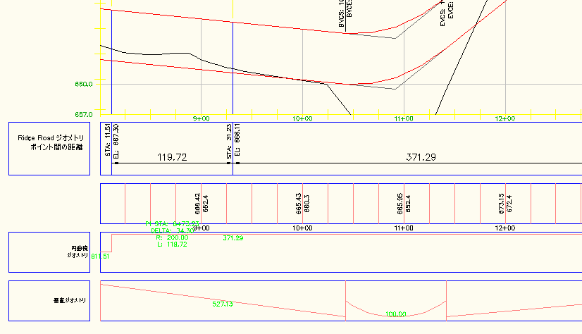 データ帯は、縦断ビューと横断ビューで詳細情報(横断間の差、縦断ジオメトリ、線形上の横断勾配摺り付けなど)を表示するための手段です。データ帯は、各グラフの上部または下部に配置される 1 つまたは複数の帯で構成され、ティック マーク、グラフィックス、およびグラフの対象の特定のフィーチャを記述するラベルを備えています。