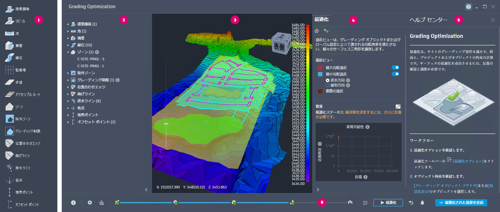 ヘルプ センター: このパネルでは、Grading Optimization で作業する際の状況に応じたガイダンスを提供します。ワークフロー、サンプル図面、関連する学習コンテンツへのリンクも使用できます。
