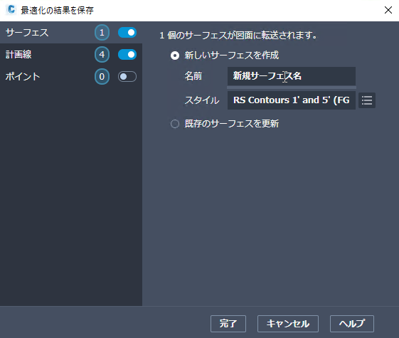 グレーディングされたサーフェスを Civil 3D に送信するには、下部ツールバーで[最適化された結果を送信]ボタンをクリックします。Civil 3D で、新しいウィンドウが表示されます。最適化されたサーフェスは、新しいサーフェスとして図面に転送したり、既存のサーフェスを更新することができます。