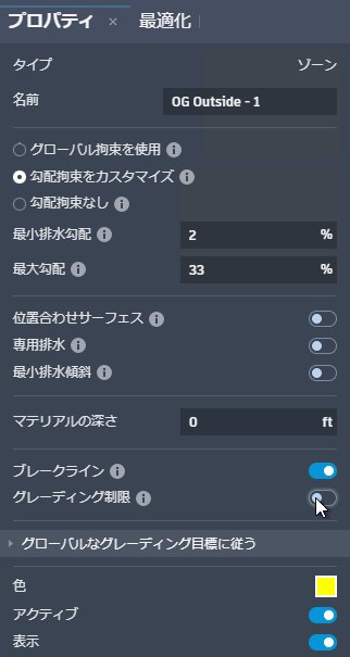 視覚化表示: 最適化されたグレーディング データの表示領域です。最適化中および最適化後にサーフェスを表示するために、いくつかの表示テーマを使用できます。画面の左側にあるスライドはサーフェスの等高線を強調し、標高のわずかな変化を見やすくします。