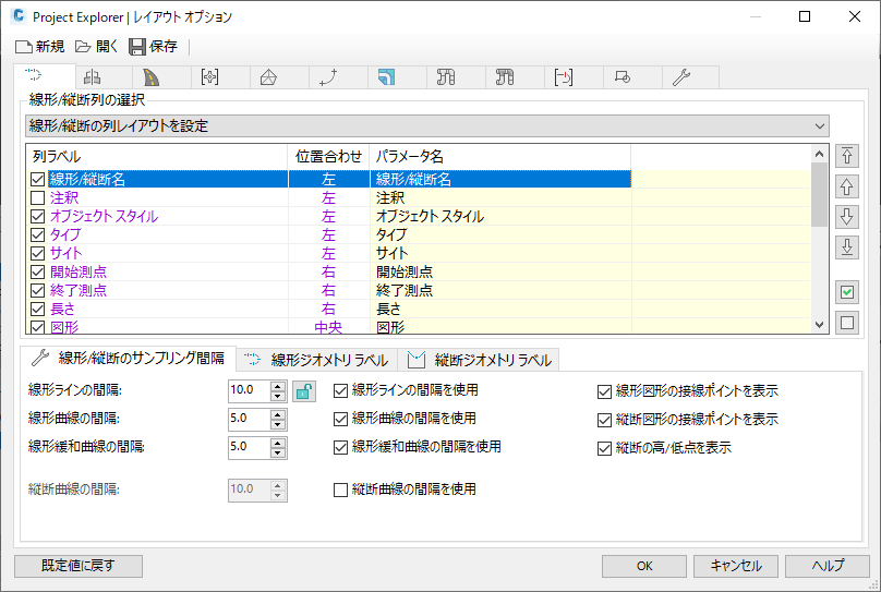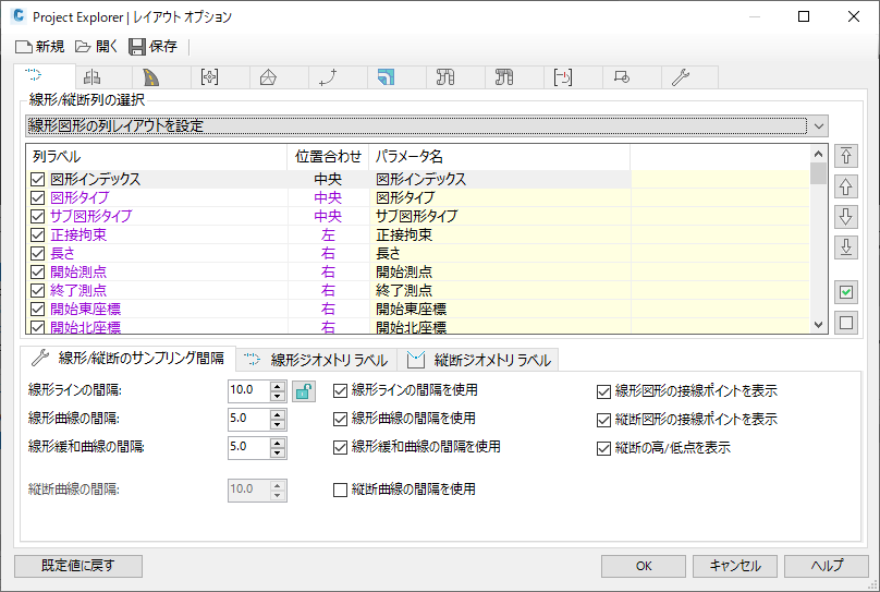 - [レイアウト オプション]ダイアログ ボックスの[線形]タブで、[線形/縦断の列レイアウトを設定]が選択されていることを確認します。
