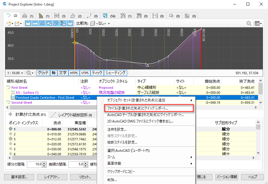 [計算された測点]サブオブジェクト タブが選択されていることを確認し、選択した縦断を右クリックして、右クリック メニューから[ファイルにクイック レポート(計算された測点)]を選択します。